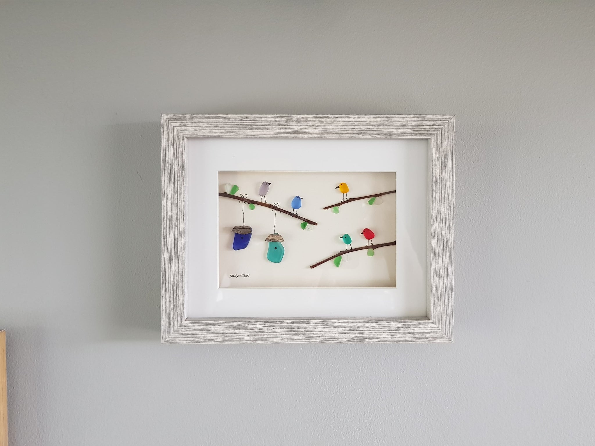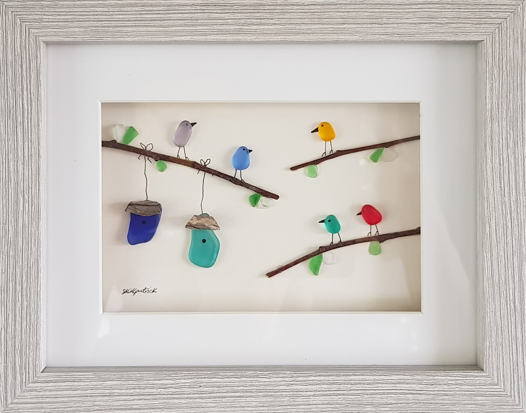 "Colourful Birds" is a unique handmade sea glass artwork from Sophie Kirkpatrick.