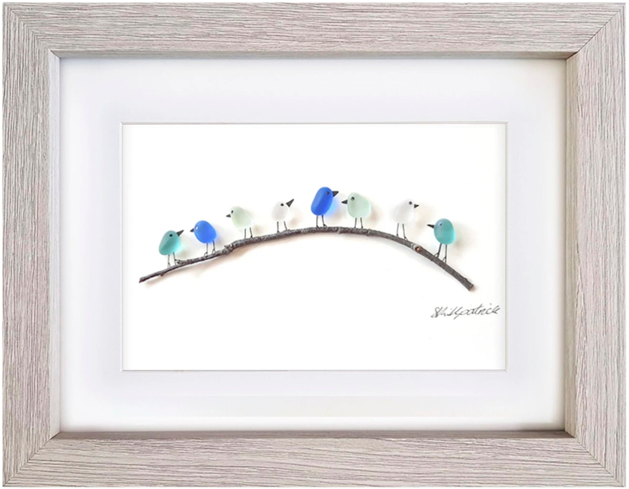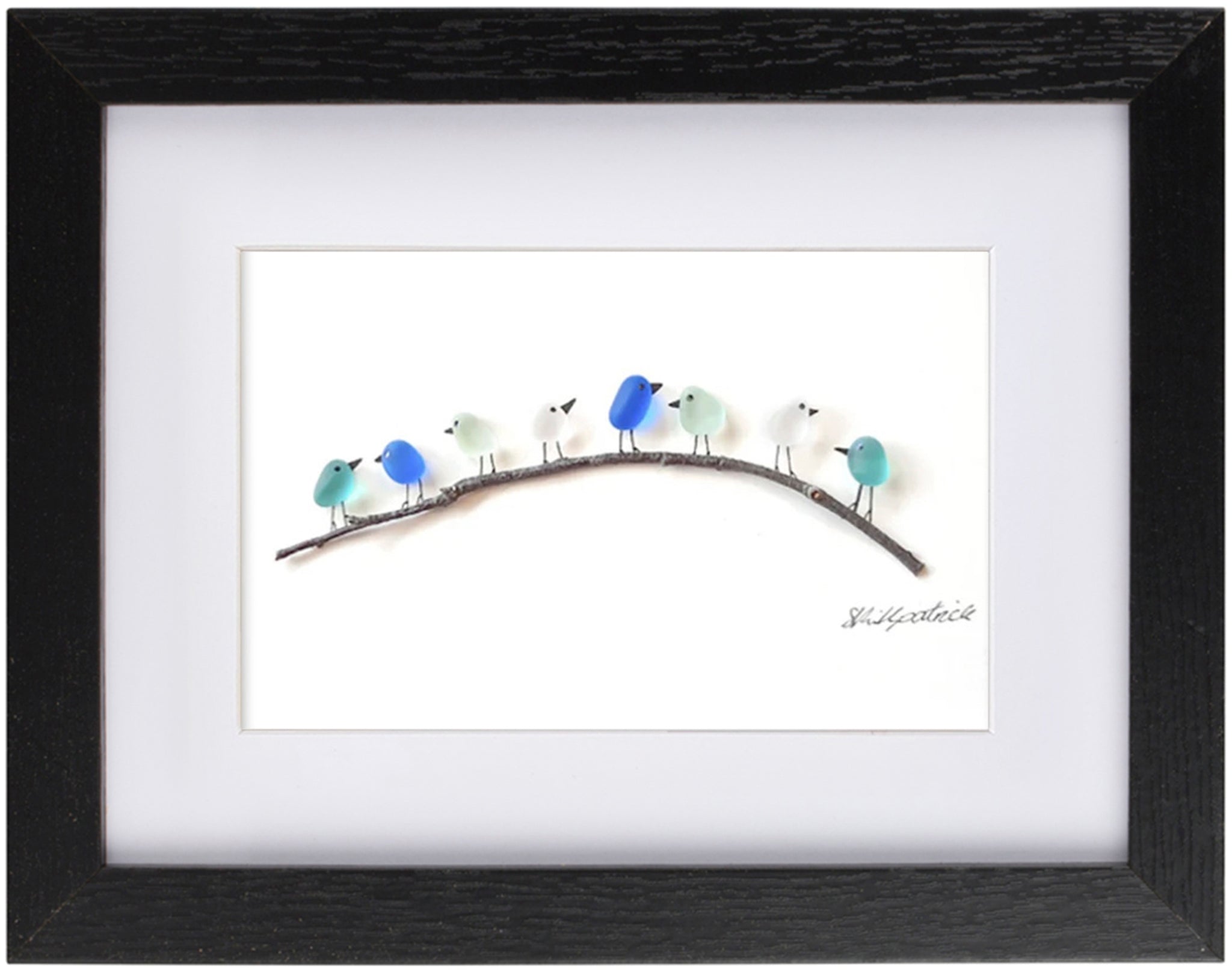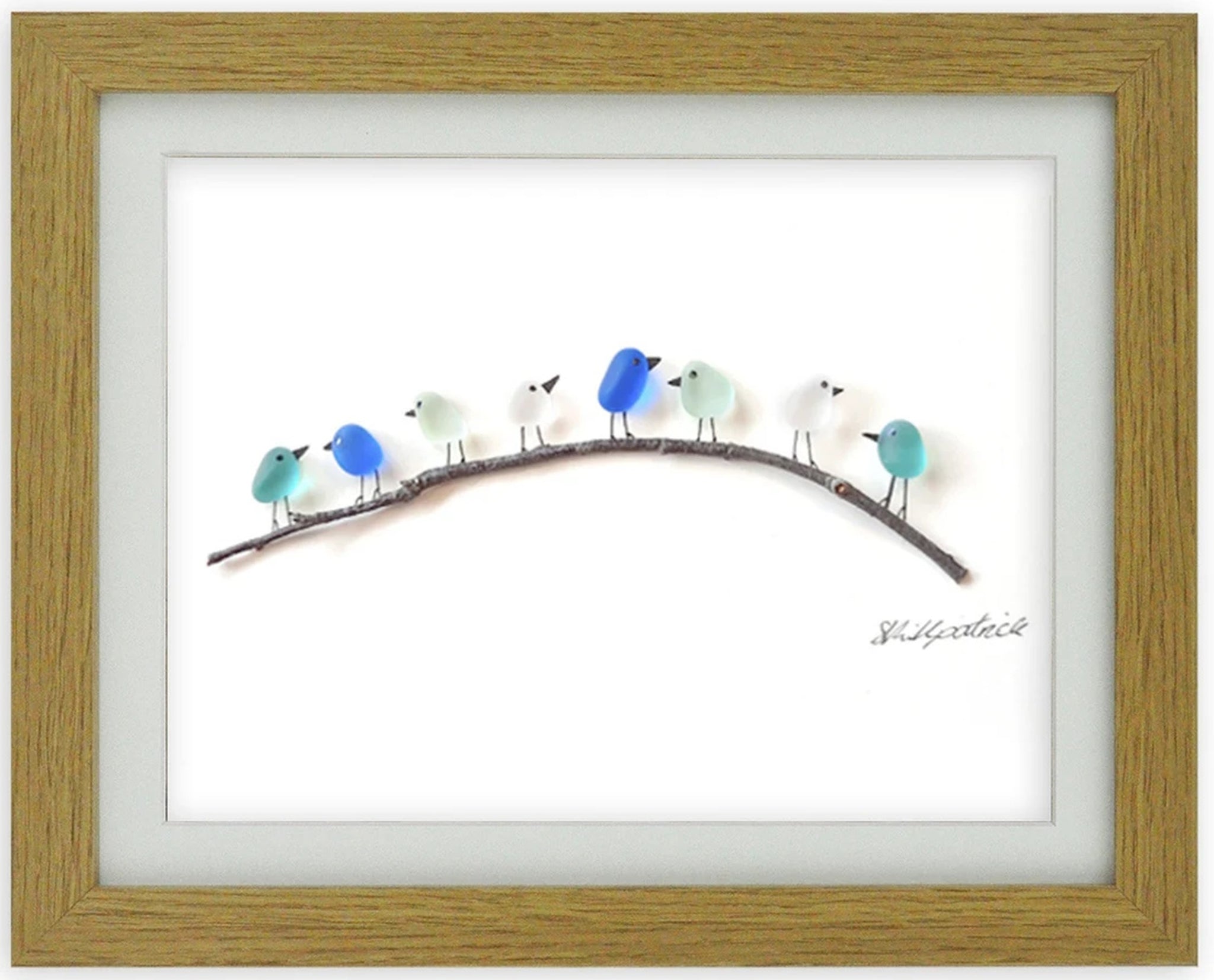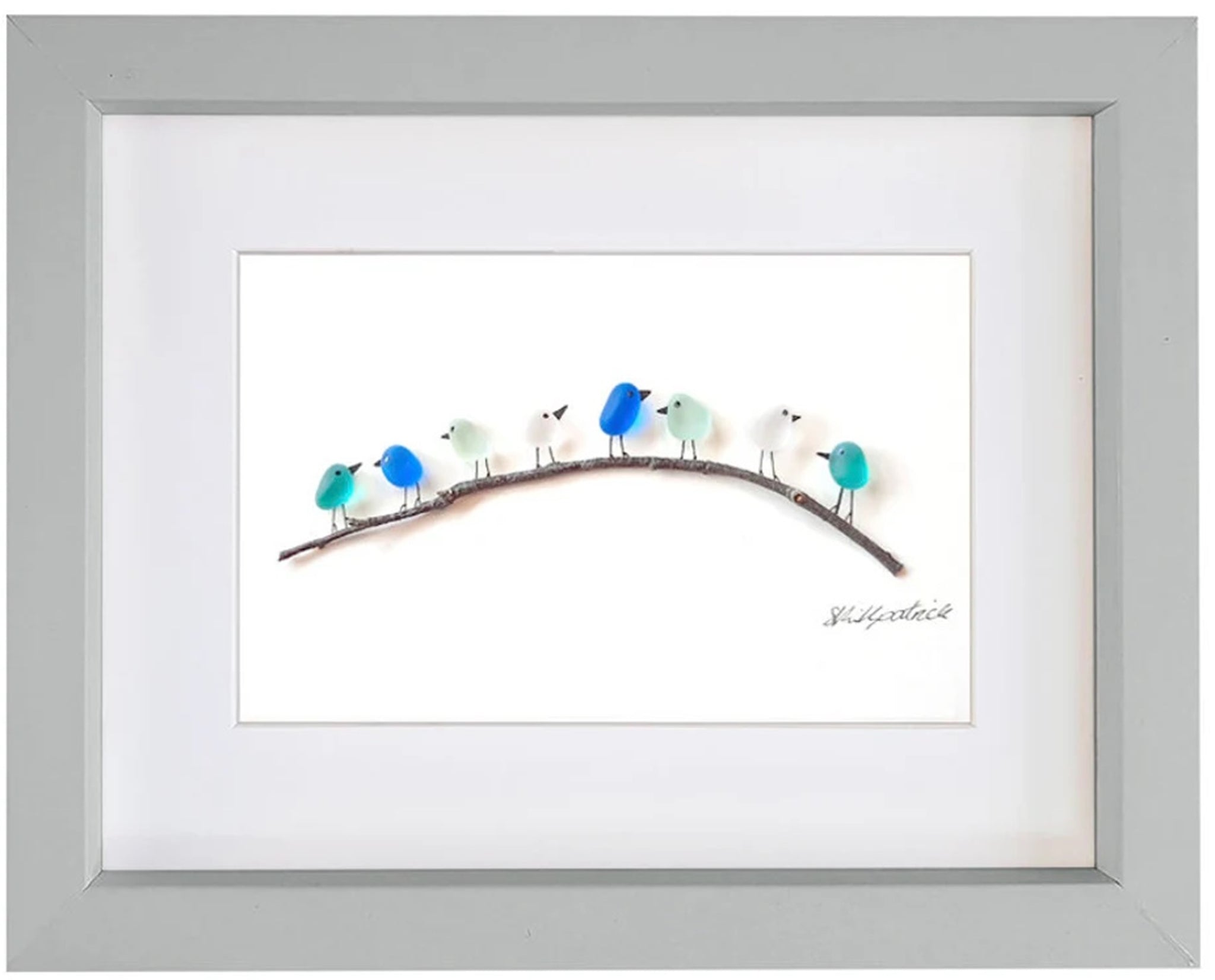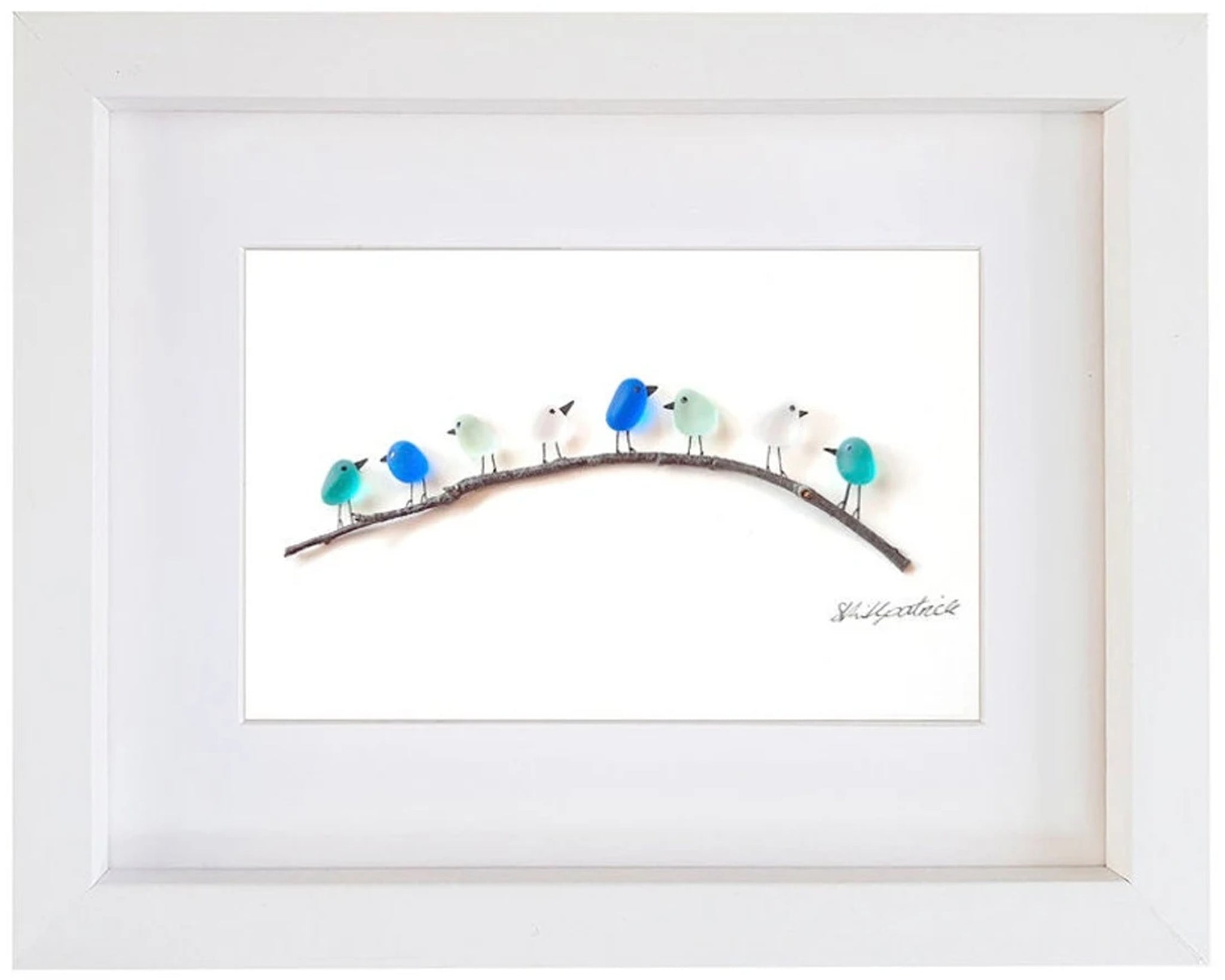 "Sea Spray Birds on Branch" is a unique handmade sea glass artwork from Sophie Kirkpatrick.